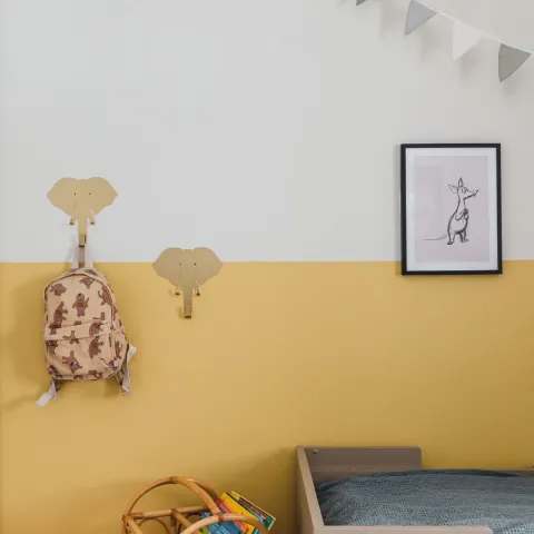 Ja vēlaties bērnu istabā izveidot vienkāršu interjeru, bet tomēr gribat spēlēties ar toņiem, varat to panākt, uz sienas krāsojot divas zonas atšķirīgi. Kāda ir jūsu bērna mīļākā krāsa? Atrodiet harmonisku kontrastu, apvienojot klusinātu toni ar košu tā nokrāsu. Divu toņu dizains kalpo kā daudzpusīgs fons dažādiem dekoru elementiem, piemēram, mākslas darbiem, drēbju vai somu pakaramajiem un sienas