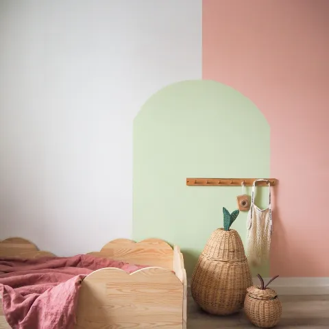 Ļaujiet bērnam izteikt viedokli par toņu un formu izvēli, un jūs kopā izveidosiet unikālu telpu, kurā bērns jutīsies kā mājās. Vai jūsu bērns dod priekšroku maigām vai košām toņu shēmām? Kā būtu, ja uz sienas uzzīmētu slepenas durvis vai kāpnes, kas ved uz viņu iecienītāko vietu nebeidzamam rotaļu laikam? Varbūt uzgleznojiet apli aiz spoguļa vai pasteļtoņu varavīksni virs gultas galvgaļa. Ļaujiet savam radošumam plūst un piepildiet bērnu sapņus.
