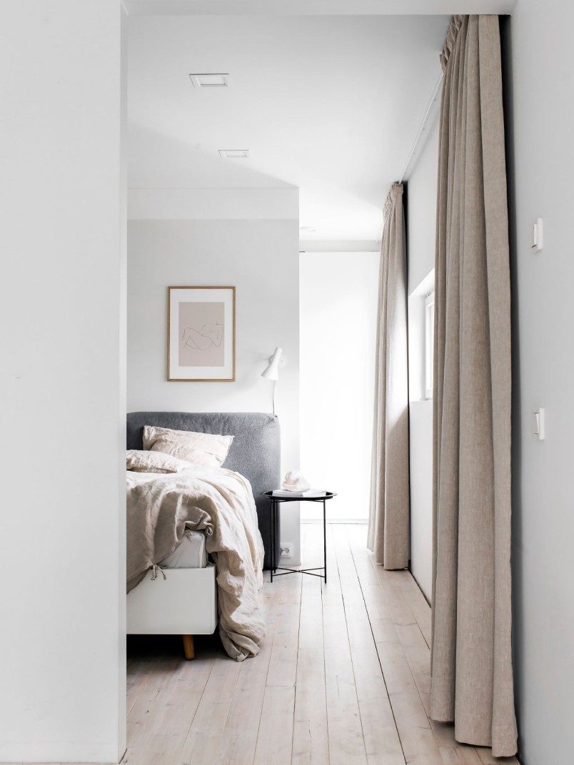 Novietojot toņu paraugus uz sienas, biju pārsteigta par to, kā Feather, kas šķita parasts balts tonis, pārvērtās par ko vairāk nekā vienkārši baltu krāsu. Tonis skaisti apvienoja gultas pelēko vilnas galvgali un dabīgos lina palagus un aizkarus, visam piešķirot harmonisku izskatu.