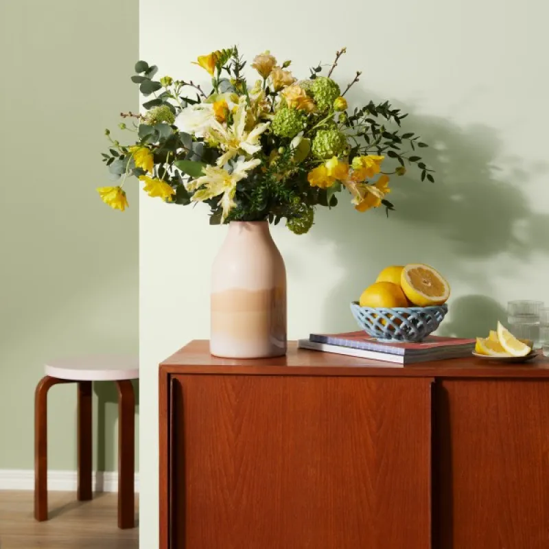 Puķu pumpuru maigi zaļais tonis. Gaisma maina šī maigā un zemes zaļā toņa izskatu. Izmantojiet to dzīvojamā istabā vai guļamistabā, lai radītu nomierinošu iedarbību.